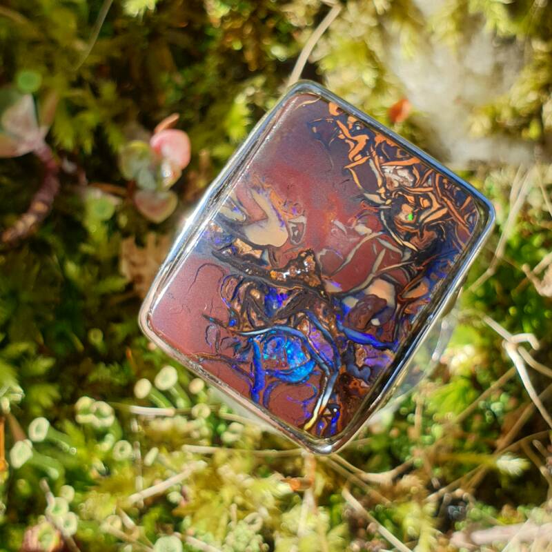 Een prachtige bijna vierkant en platte Australische boulderopaal die Toon in een ring van hightech edelstaal heeft gezet.