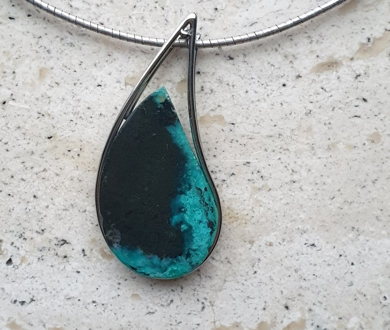 Het grote contrast tussen het bijna zwarte- en het blauw/groene gedeelte zorgt voor een extra dimensie in deze hanger.