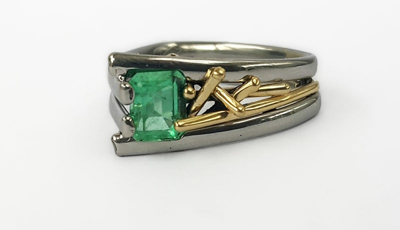 Driehoekige ring van chirurgisch staal met geelgoud waarin een mooie smaragd verwerkt is